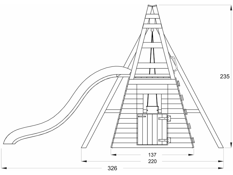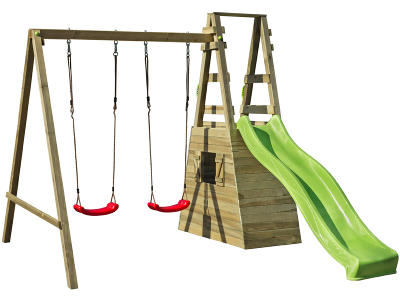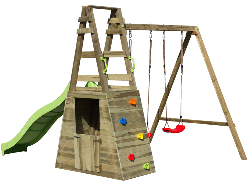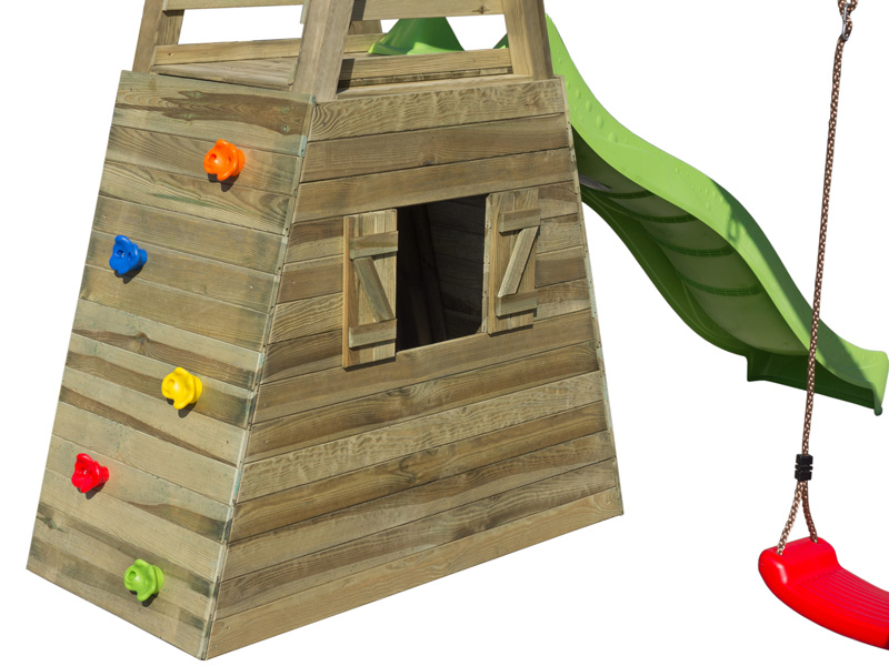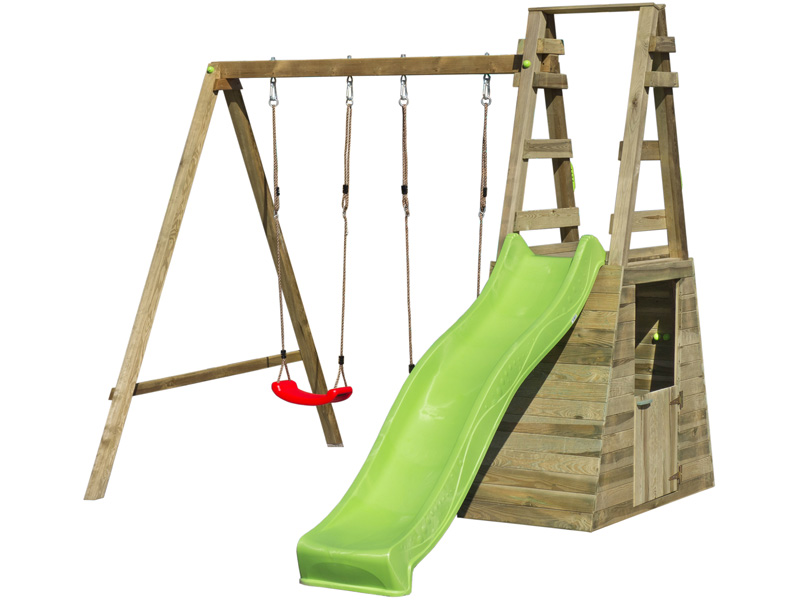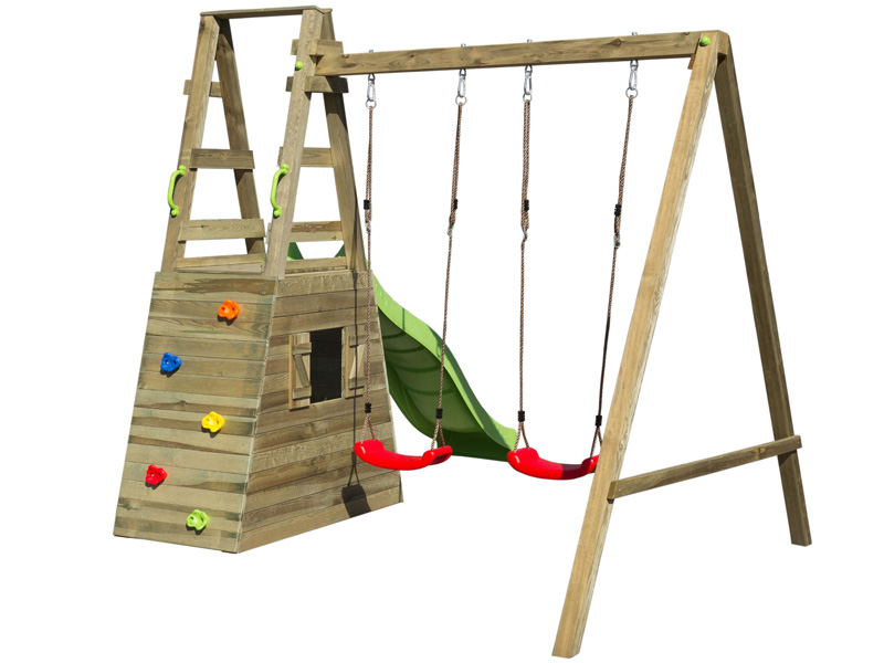 Huśtawka podwójna ze ślizgiem, ścianką wspinaczkową i domkiem
