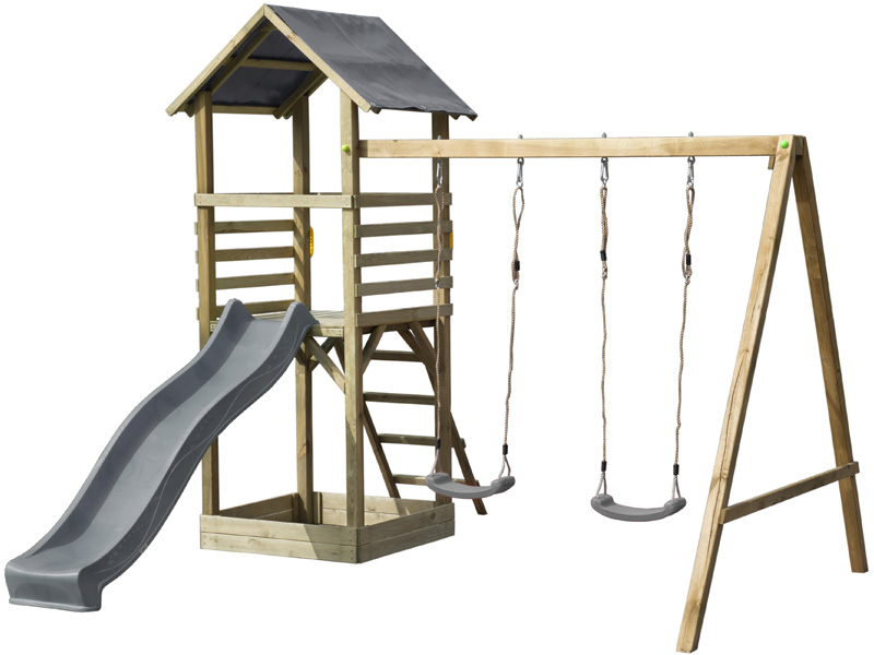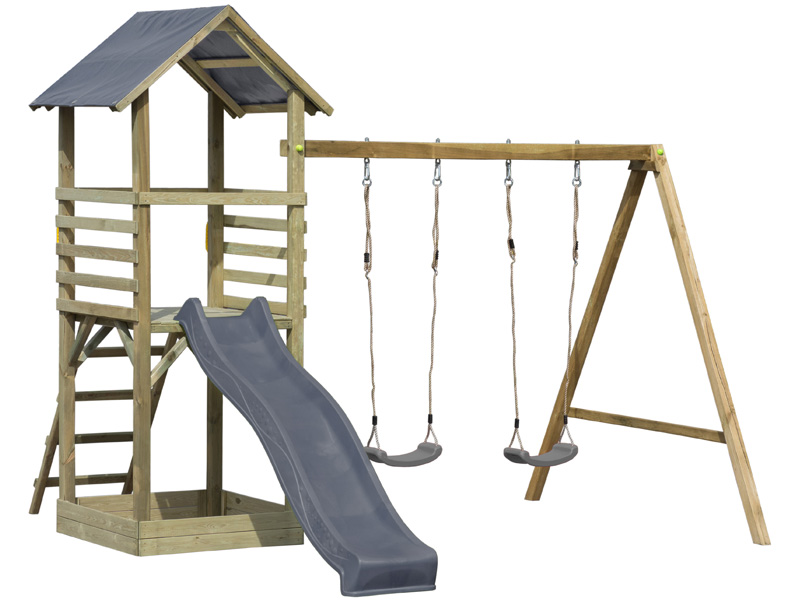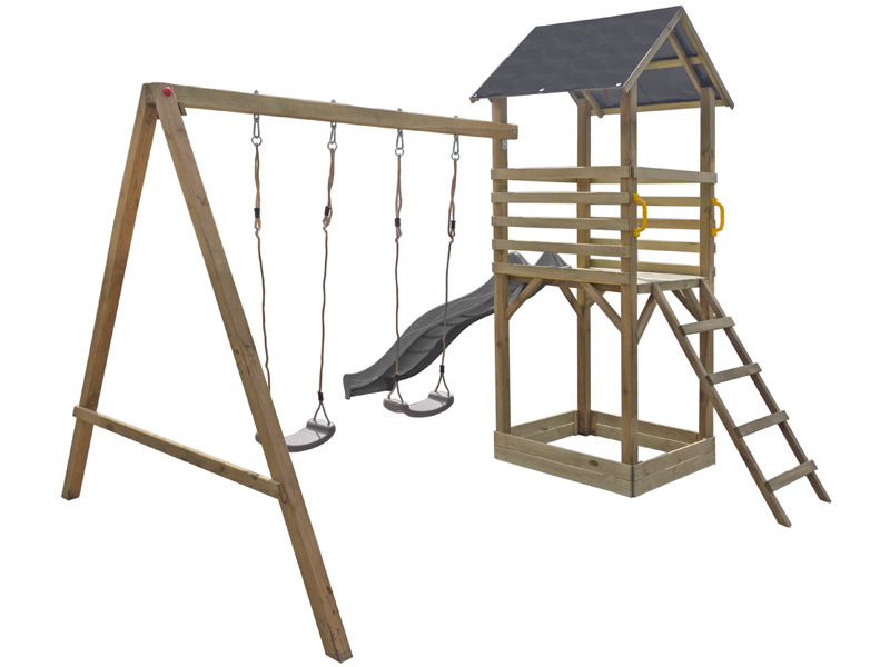 Głównym elementem zestawu jest drewniany domek w formie wieży, którego podstawa ma 100 x 100 cm. Należy ponadto uwzględnić długość ślizgu – to aż 240 cm. W bocznej części docelowo zamontowana ma być belka do zawiesi o długości ponad 200 cm, co również trzeba wziąć pod uwagę, tworząc miejsce rozrywki dla najmłodszych.